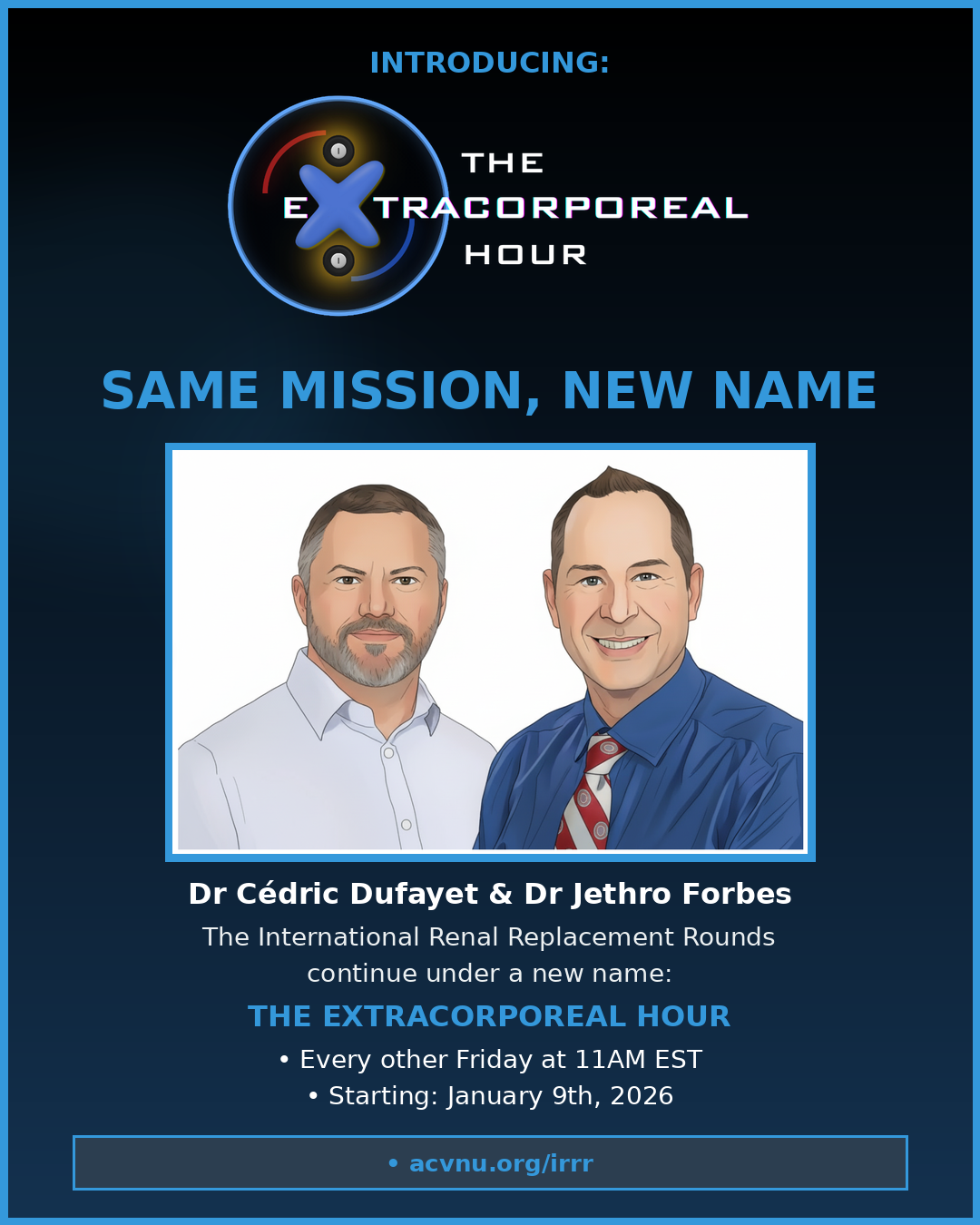 The Extracorporeal Hour, formally know as “International Renal Replacement Rounds (IRRR)”, is a casual online meeting with the many of the world's leaders in extracorporeal therapies to discuss patients, treatments, complications, equipment, and anything related to hemodialysis, therapeutic apheresis, and hemoperfusion. This is a free forum open to anyone (novice or experienced) interested in extracorporeal therapies.